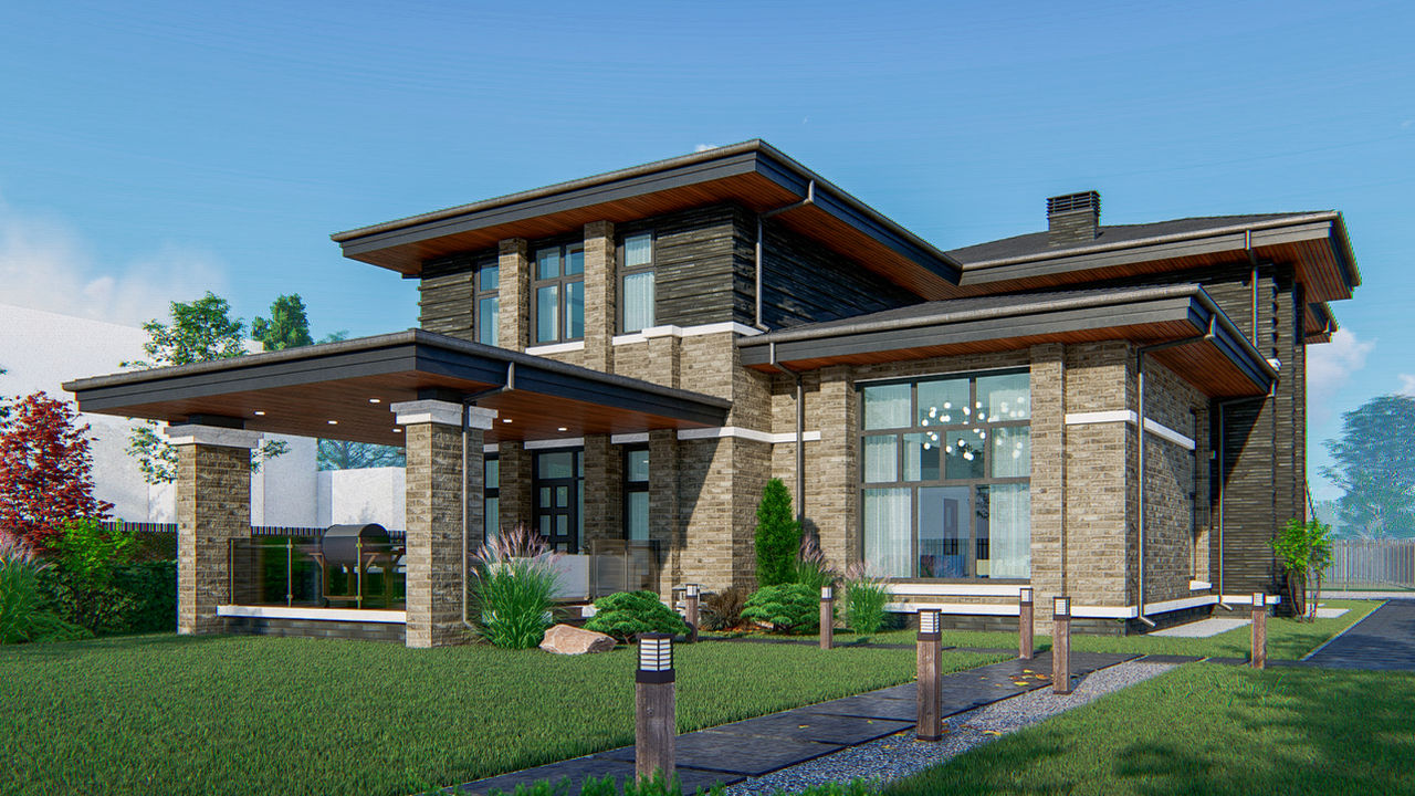 Создание проекта загородного дома с гаражом на два места в стиле прерий для семьи из четырех человек