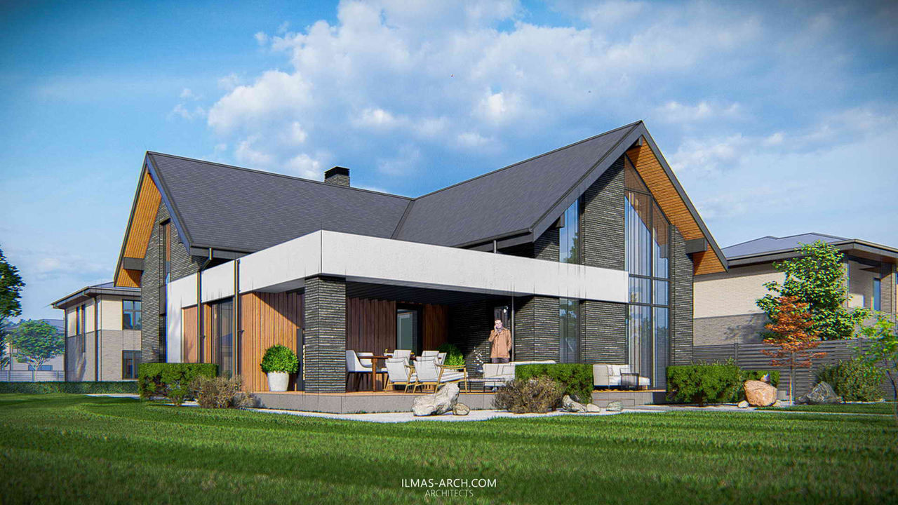 Спроектировать и разместить на участке Дом в стиле современного шале с отдельно стоящим гаражом на два автомобиля для непостоянного проживания семьи из 3-5 человек из не дорогих материалов и технологий.