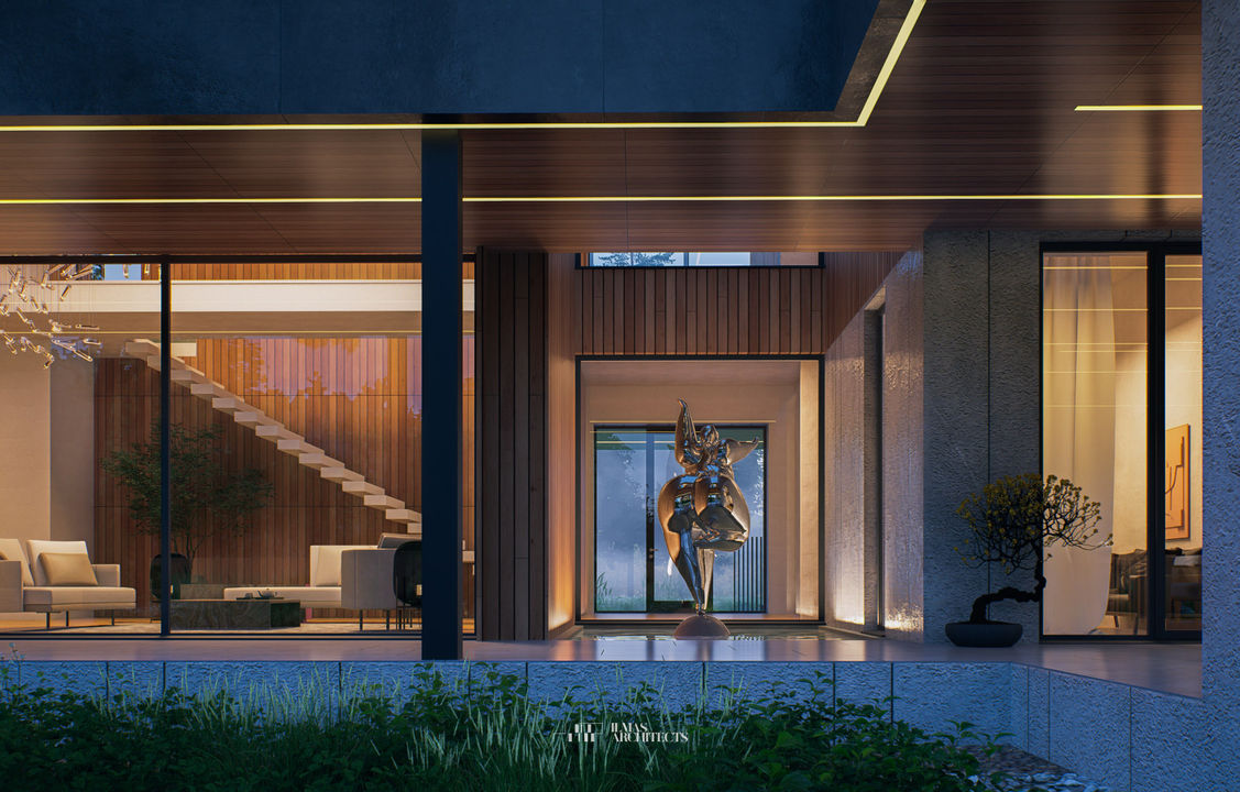 Для выполнения тех.задания по площади и количеству помещений клиента, сделали дом двухэтажным, максимально приблизив его к разрешенной границе капитального строителсьтва участка, что сделало дворовое простанство большим на сколько это возможно.