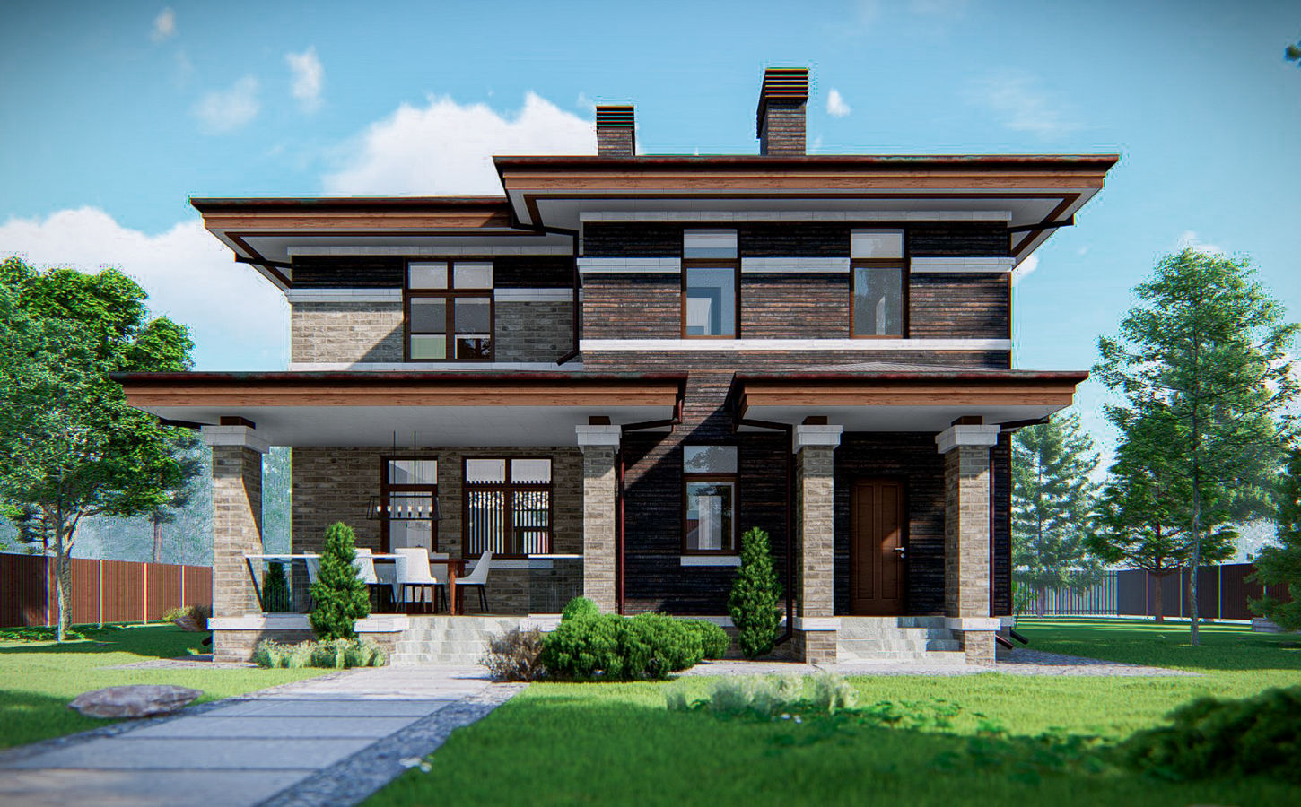 Задача: Проектирование и размещение на узком участке современного загородного дома. Каркас здания монолитный. Здание двухэтажное с встроенным гаражом на одно машиноместо, с дворовой стороны встроена зоной отдыха в виде летней крытой террасы, бани и зоной BBQ. Зона гостиной с вторым светом и и большим витражным, панорамным окном в два этажа.