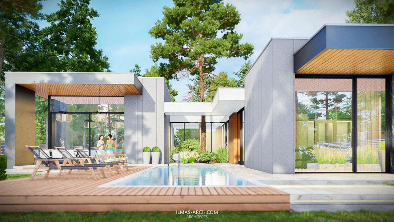 Создание и размещения в на участке с соснами проекта одноэтажного загородного дома